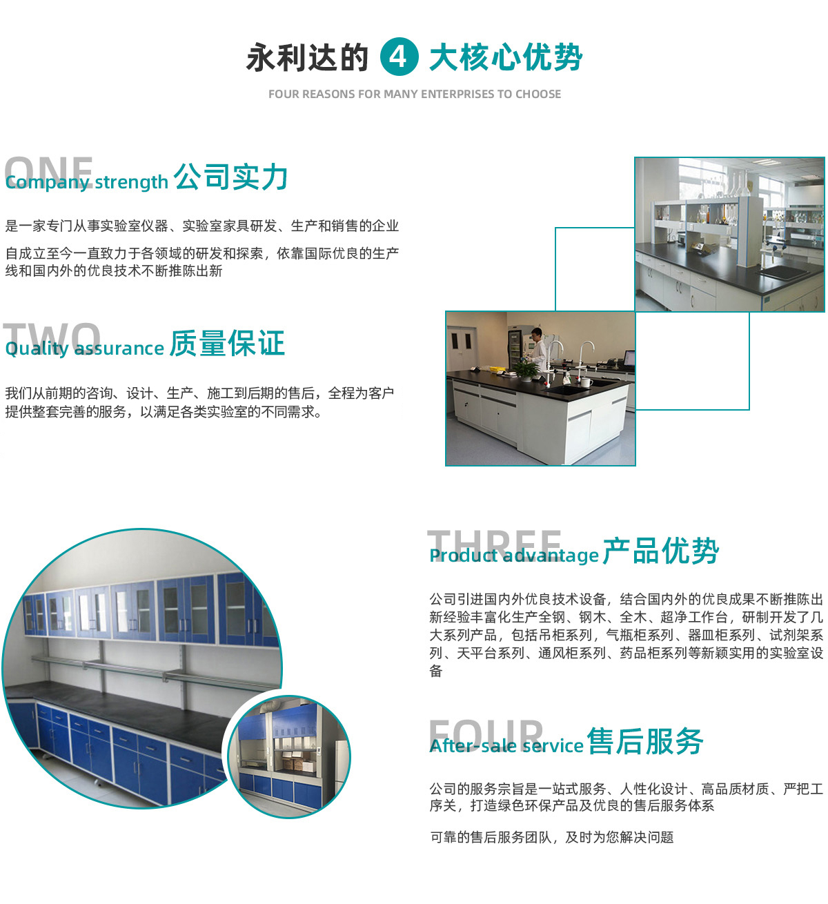 天津永利達(dá)實(shí)驗(yàn)室設(shè)備有限公司是一家從事實(shí)驗(yàn)室家具研發(fā)、生 產(chǎn)、銷(xiāo)售與服務(wù)于一體的企業(yè)。成立于2006年,坐落于天津市靜海高新產(chǎn)業(yè)園區(qū)。公司秉承“科技創(chuàng)新、質(zhì)量為本、服務(wù)至上”的理念,致力于為用戶(hù)提供實(shí)驗(yàn)室家具和整體解決方案。 公司的主要業(yè)務(wù)涵蓋了實(shí)驗(yàn)室家具、實(shí)驗(yàn)室通風(fēng)、凈化、集中供氣、純水及裝修等多個(gè)領(lǐng)域,憑借多年在實(shí)驗(yàn)室行業(yè)的積累,和不斷吸收國(guó)際上的技術(shù)與設(shè)計(jì)理念,我們從前期的咨詢(xún)、設(shè)計(jì)、生產(chǎn)、施工到后期的售后,全程為客戶(hù)提供整套完善的服務(wù),以滿(mǎn)足各類(lèi)實(shí)驗(yàn)室的不同需求。 公司的服務(wù)宗旨是 提供人性化設(shè)計(jì)、材質(zhì)、嚴(yán)把工序關(guān),打造綠色環(huán)保產(chǎn)品及完善的售后服務(wù)體系。